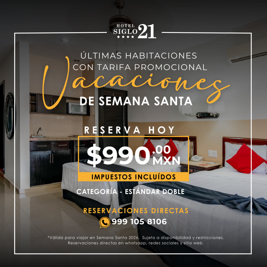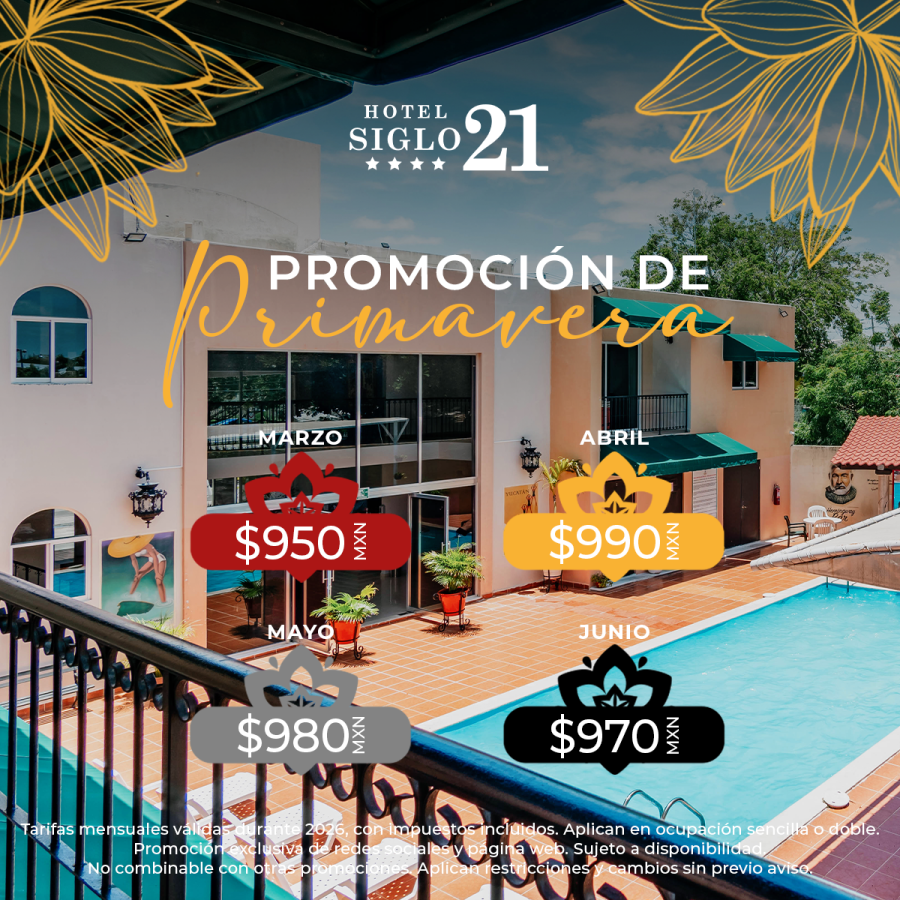 El Hotel Siglo 21 está situado en el norte de la Ciudad de Mérida, a pocos metros del centro de convenciones Siglo XXI y a menos de 1 km del Museo Mundo Maya. Por la ubicación estratégica en una de las principales avenidas de la Ciudad, el hotel se encuentra rodeado de plazas, restaurantes, zona de negocios, entre otros; la salida a puerto Progreso, está a un par de minutos y aeropuerto internacional Manuel Crescencio Rejón está a 12 km de distancia.